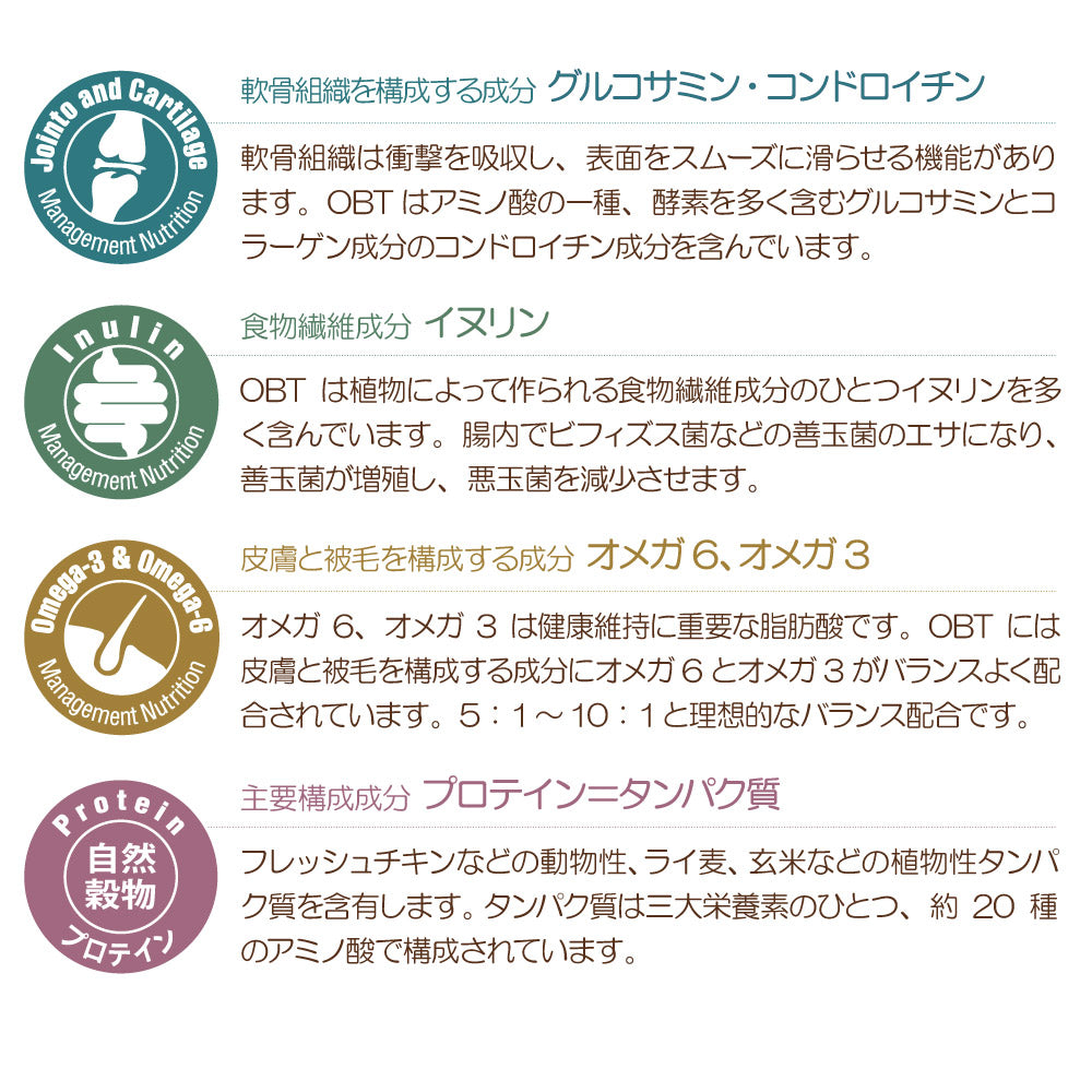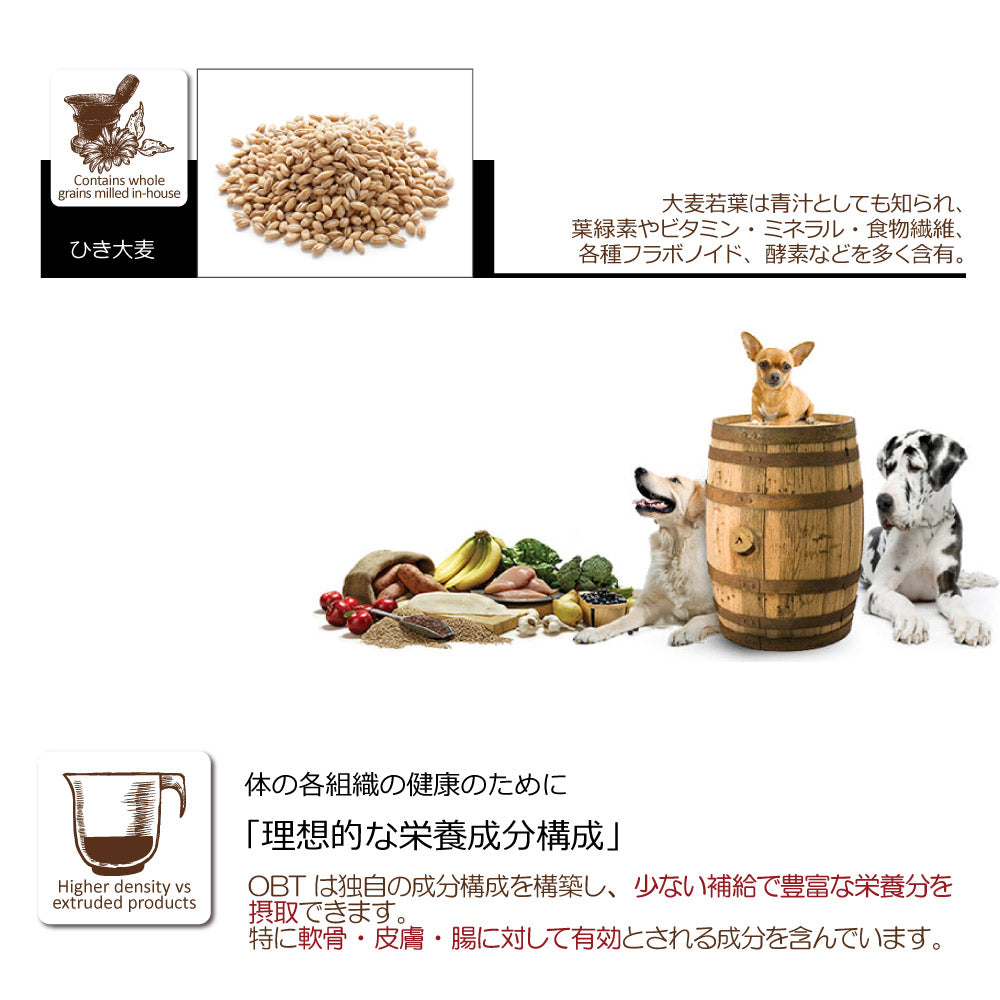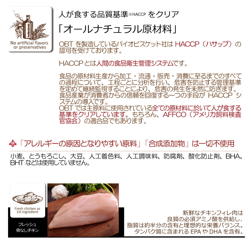 | 穀物アレルギーのペットでも安心!穀物を一切使用せず、オーブンベークド製法でナチュラル原材料を丹念に調理したナチュラル・ホリスティックフード。 オールステージ 全ての犬種向きです。 ■10倍の時間をかけた「オーブンベークド製法」■ オーブンベークドトラディション(※以下 OBT)は従来のドライフードの製造にかかる時間の、実に10倍の時間をかけて丹念に調理されています。 一般によくあるドライフードは製造コストを抑えるために高温で加工することが多く、その結果、栄養分は破壊されてしまいます。 OBTは低温でじっくりと時間をかけることで、香り・風味・栄養分を損なうことなく保持することが可能となりました。 「オーブンベークド製法」は粒がカチカチに硬くなることがなく、 簡単に噛み砕けて、消化吸収に優れています。 ■オールナチュラル原材料■ OBTを製造しているバイオビスケット社はHACCP(ハサップ)の認可を受けております。 HACCPとは人間の食品衛生管理システムです。 OBTでは主原料に使用されている全ての原材料に於いて人が食する基準をクリアしています。もちろん、AFFCO(アメリカ飼料検査官協会)の適合品でもあります。 |