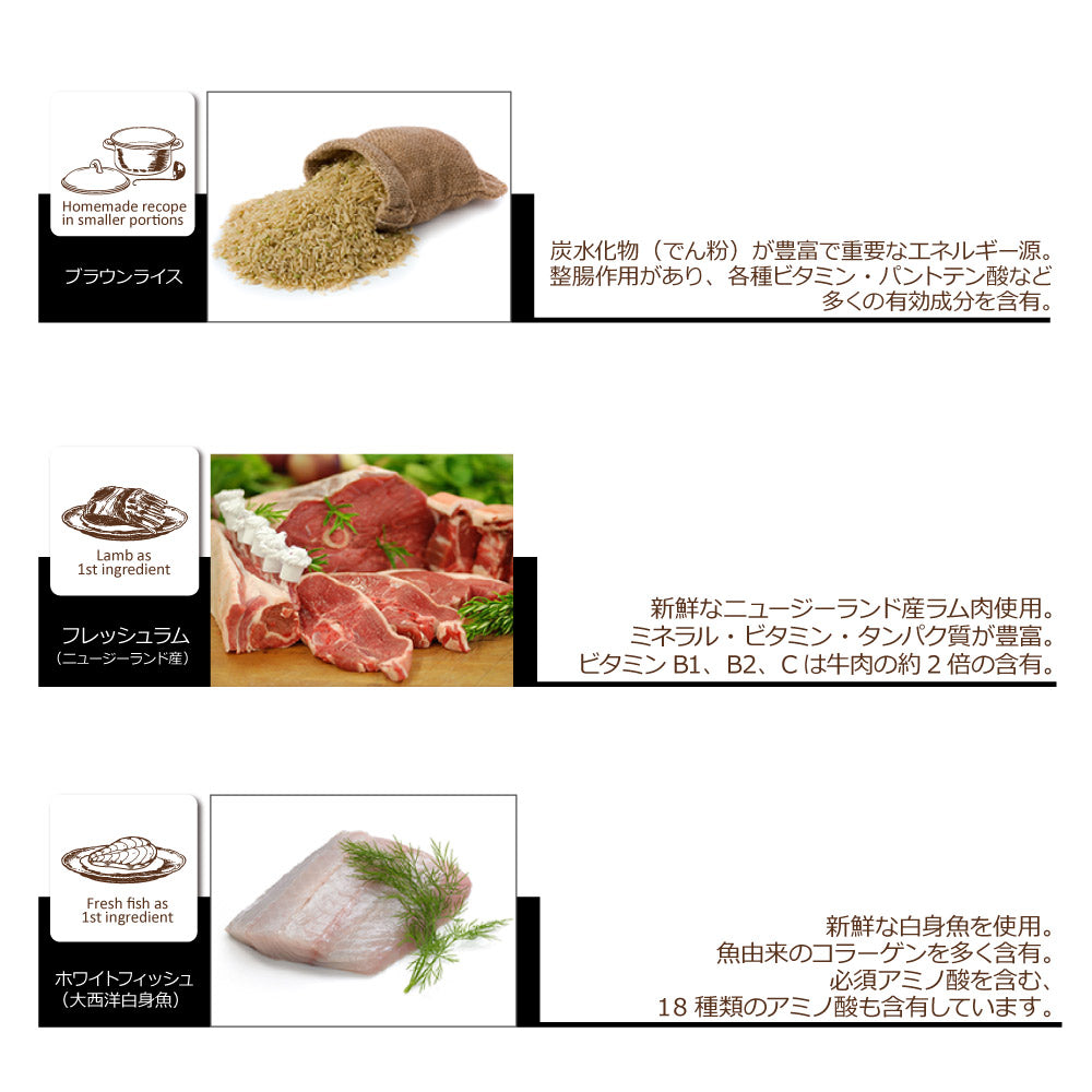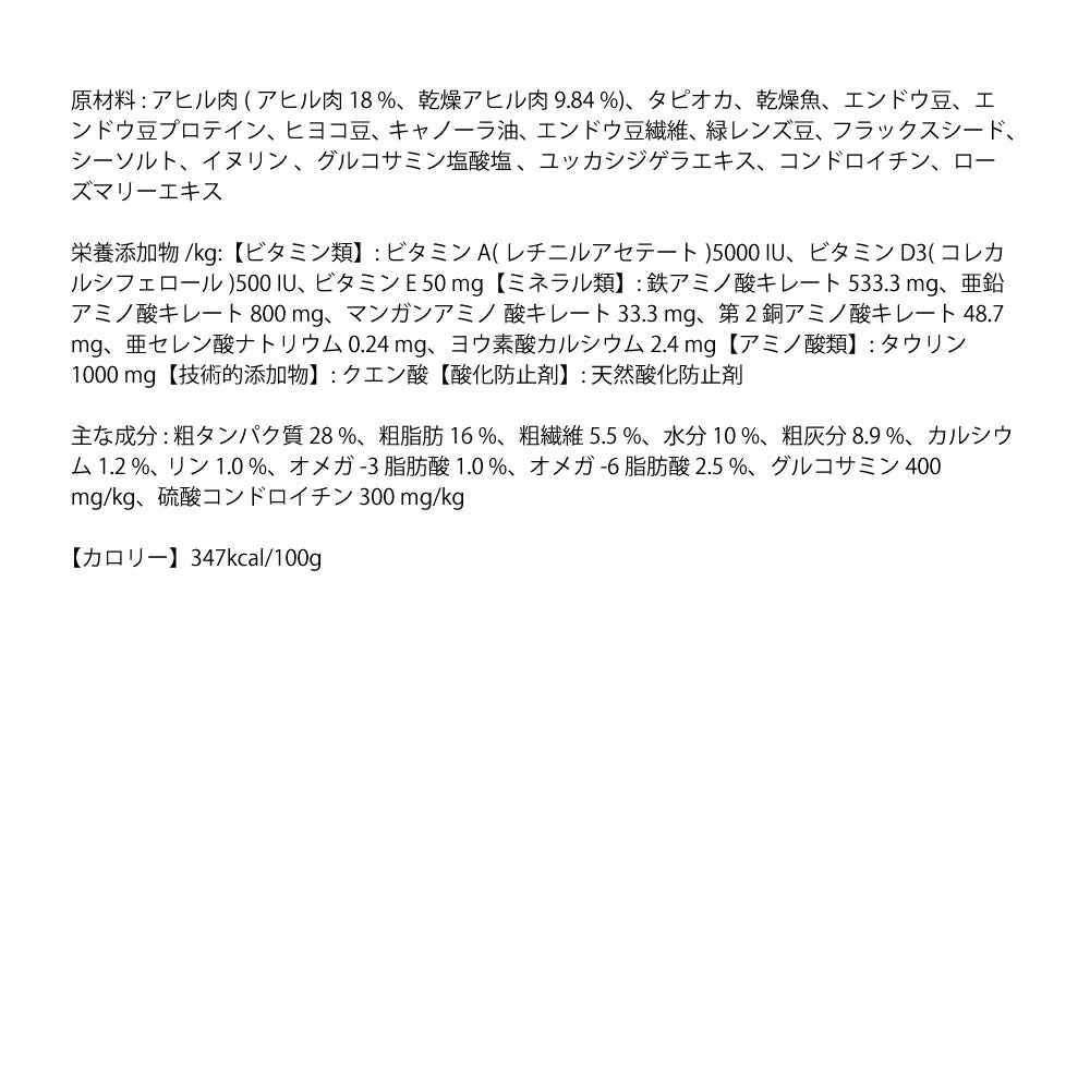 | 原材料 | アヒル肉(アヒル肉18%、乾燥アヒル肉9.84%)、タピオカ、乾燥魚、エンドウ豆、エンドウ豆プロテイン、ヒヨコ豆、キャノーラ油、エンドウ豆繊維、緑レンズ豆、フラックスシード、シーソルト、イヌリン、グルコサミン塩酸塩、ユッカシジゲラエキス、コンドロイチン、ローズマリーエキス |