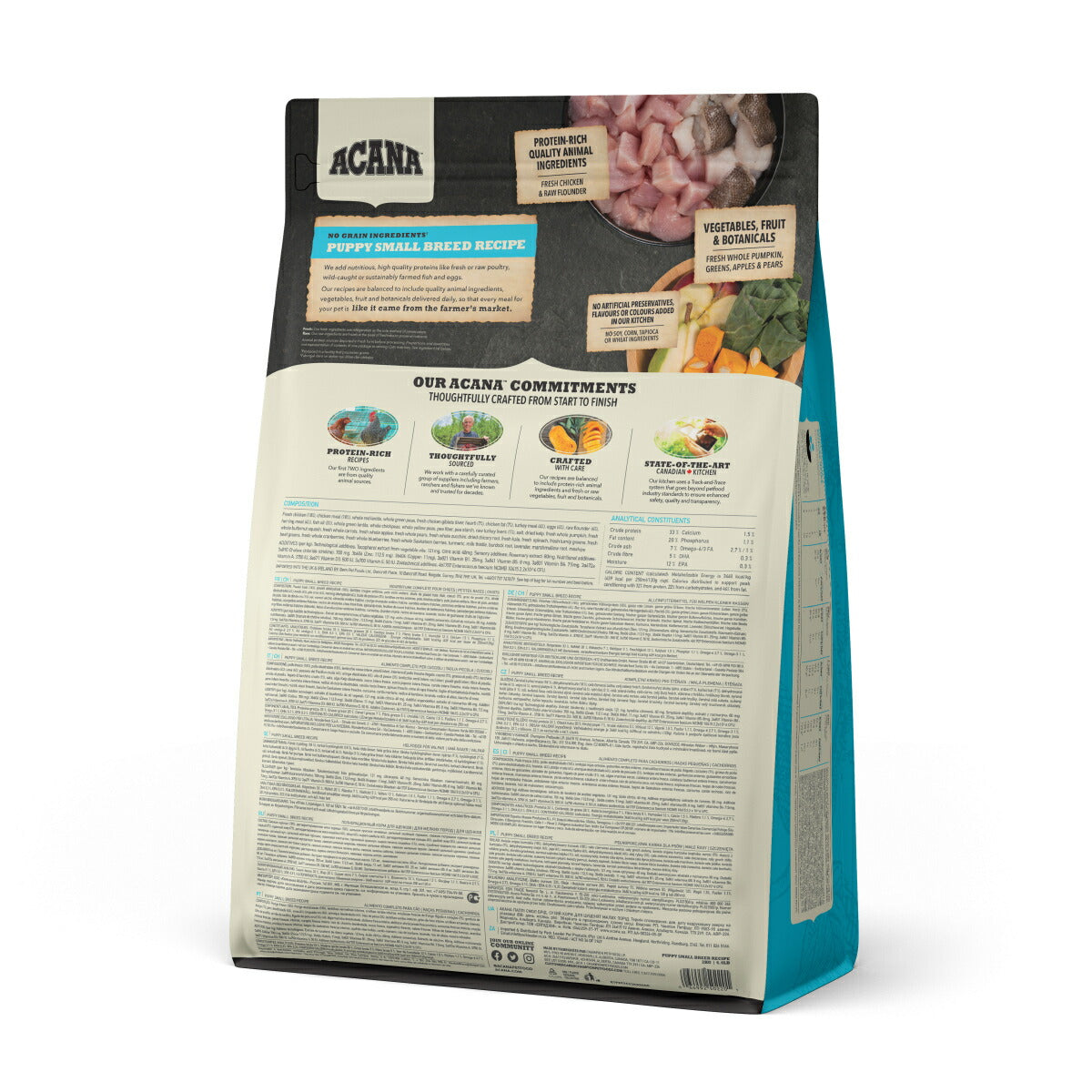 小型犬子犬の急速な成長をサポートするには、バラエティ豊かな新鮮丸ごと肉のたんぱく質と脂肪を豊富に含む食事が必要です。アカナ パピー・スモール・ブリードは放し飼い鶏肉、天然魚、巣に産み落とされた卵をホールプレイ比率で新鮮な状態で搬送、風味豊かな栄養がギュッと詰まっています。米、タピオカ、ジャガイモといった消化吸収が早い炭水化物はゼロで豊富な肉たんぱく質があなたの子犬の最高の成長と健康状態へ導きます。