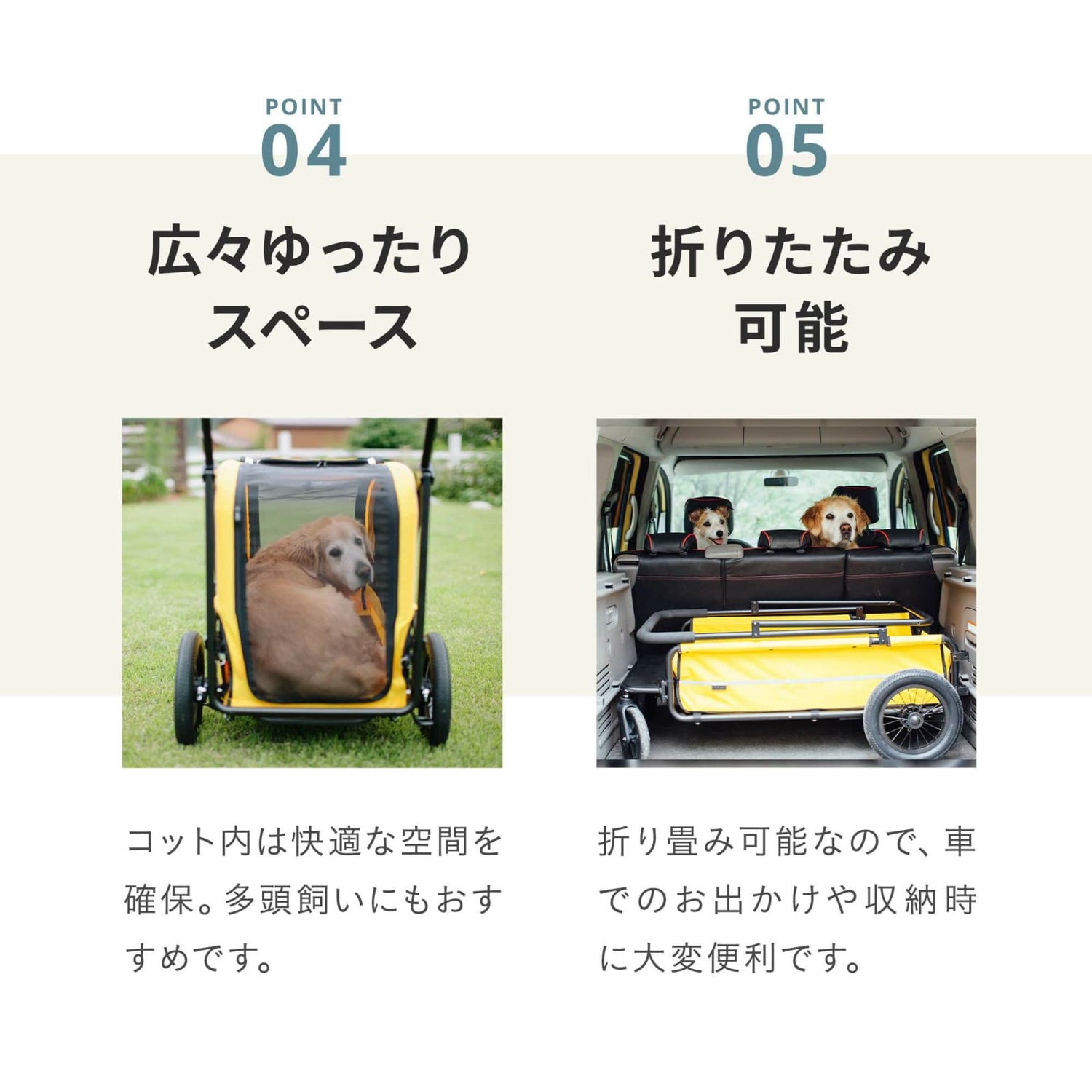 大型犬用に開発された耐荷重55kgの4輪カート。体重の重い大型犬を乗せても、4輪の安定性と3角構造の軽快な押し心地でスムーズな走行が可能です。愛犬が開放的に乗ることができるオープンタイプで、荷物が多い時は台車としてもご使用いただけます。また、別売りのルーフ(別売り)を装着すれば、突然の飛び出しや移動時にも安心。本体後部にはスロープを装備し、足腰の弱い老犬でも乗り降りがしやすいデザインになっています。