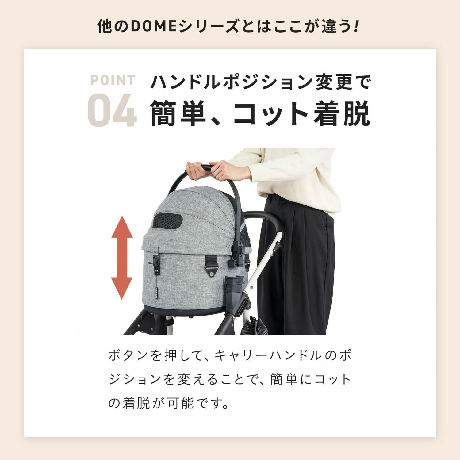 | 簡単にフレームにドッキング ドッキングはコットハンドルを垂直にした状態で上下するだけの簡単仕様。 | |
