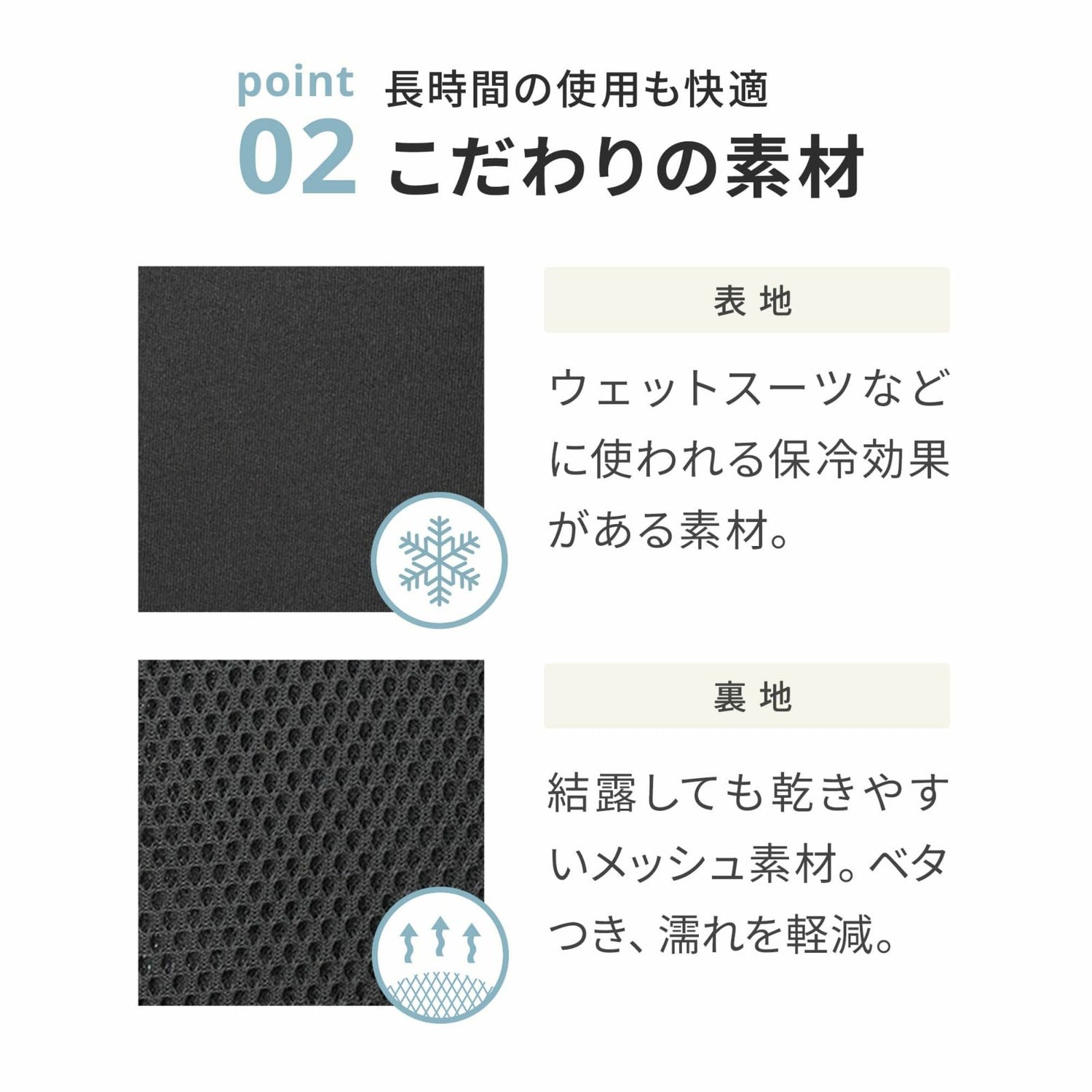 | 材質 | 【表地】ポリエステル100%(合成ゴム使用) 【裏地:メッシュ】ポリエステル100% 【保冷剤:フィルム】ナイロン/ポリエチレン 【保冷剤:内容物】水/増粘剤/不凍液 |