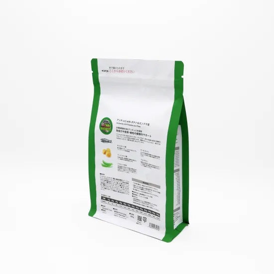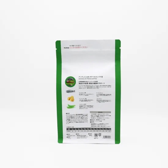 原材料 | アンチョビ、ジャガイモ、鴨油、鶏肉、ビール酵母、ビートパルプ、エンドウ豆、サーモンオイル、タンパク加水分解物、ミネラル類(亜鉛、鉄、マンガン、銅、ヨウ素、セレン、ナトリウム、塩化物)、マンナンオリゴ糖(MOS)、キシロオリゴ糖(XOS)、ビタミン類(A、D3、E)、ユッカシジゲラ、スピルリナ原末、加水分解甲殻類(グルコサミン源)、加水分解軟骨(コンドロイチン源)、乳清タンパク、自然保存料酸化防止剤(トコフェロール) |