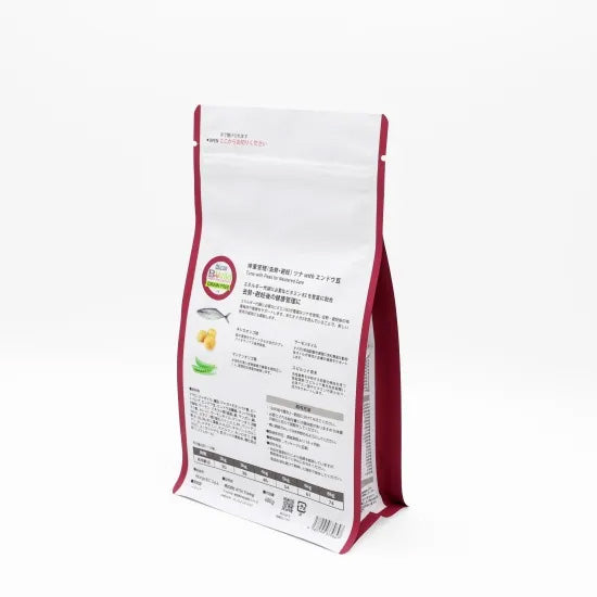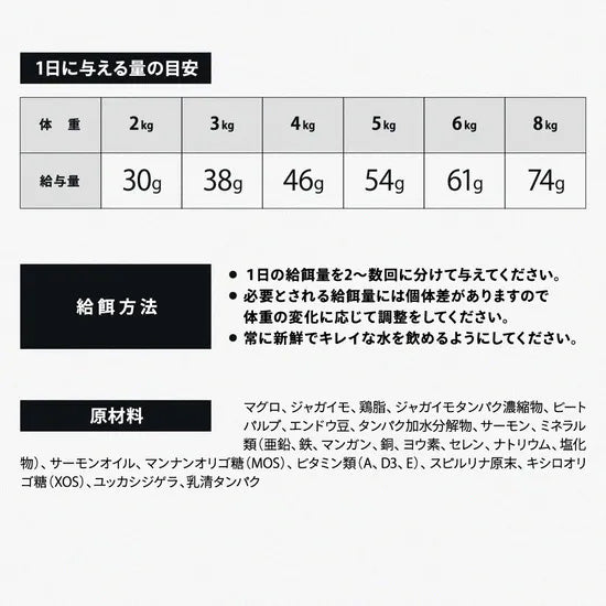 原材料 | マグロ、ジャガイモ、鶏脂、ジャガイモタンパク濃縮物、ビートパルプ、エンドウ豆、タンパク加水分解物、サーモン、ミネラル類(亜鉛、鉄、マンガン、銅、ヨウ素、セレン、ナトリウム、塩化物)、サーモンオイル、マンナンオリゴ糖(MOS)、ビタミン類(A、D3、E)、スピルリナ原末、キシロオリゴ糖(XOS)、ユッカシジゲラ、乳清タンパク、自然保存料酸化防止剤(トコフェロール) |