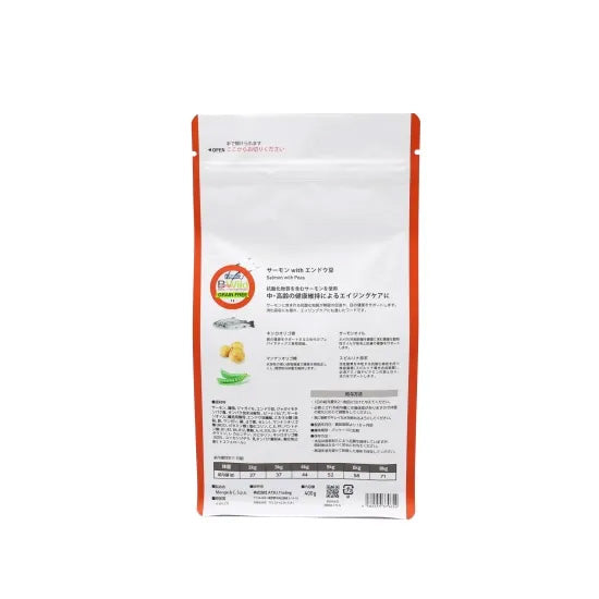 中・高齢の健康維持のためのエイジングケアにサーモンに含まれる抗酸化物質が熟眠の促進や目の健康をサポートします。消化吸収にも優れ、エイジングケアにも適したフードです。ビーワイルド サーモン with エンドウ豆の特徴『原材料に希少性の高い素材を選び、栄養豊富で高タンパク質』サーモンなど希少性の高い素材を厳選し、主原料としています。高タンパク質でありながら、低カロリーや低脂肪といった素材が持つ特徴が愛猫の成長や健康維持をサポートします。タンパク質の比率:猫が本来求める「本能に沿った食事」をコンセプトに、動物由来成分を65%以上配合『グレインフリー』食物アレルギー、食物不耐性といったリスク低減のために穀物不使用。消化にかかる胃腸への負担を軽減することで効果を最大限に。
