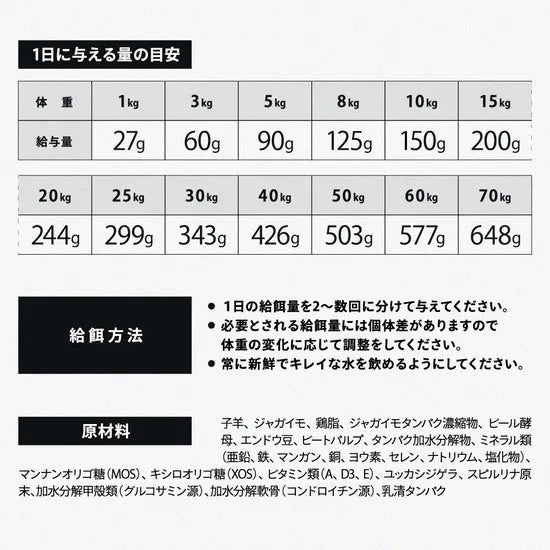 原材料 | 子羊、ジャガイモ、鶏脂、ジャガイモタンパク濃縮物、ビール酵母、エンドウ豆、ビートパルプ、タンパク加水分解物、ミネラル類(亜鉛、鉄、マンガン、銅、ヨウ素、セレン、ナトリウム、塩化物)、マンナンオリゴ糖(MOS)、キシロオリゴ糖(XOS)、ビタミン類(A、D3、E)、ユッカシジゲラ、スピルリナ原末、加水分解甲殻類(グルコサミン源)、加水分解軟骨(コンドロイチン源)、乳清タンパク、自然保存料酸化防止剤(トコフェロール) |