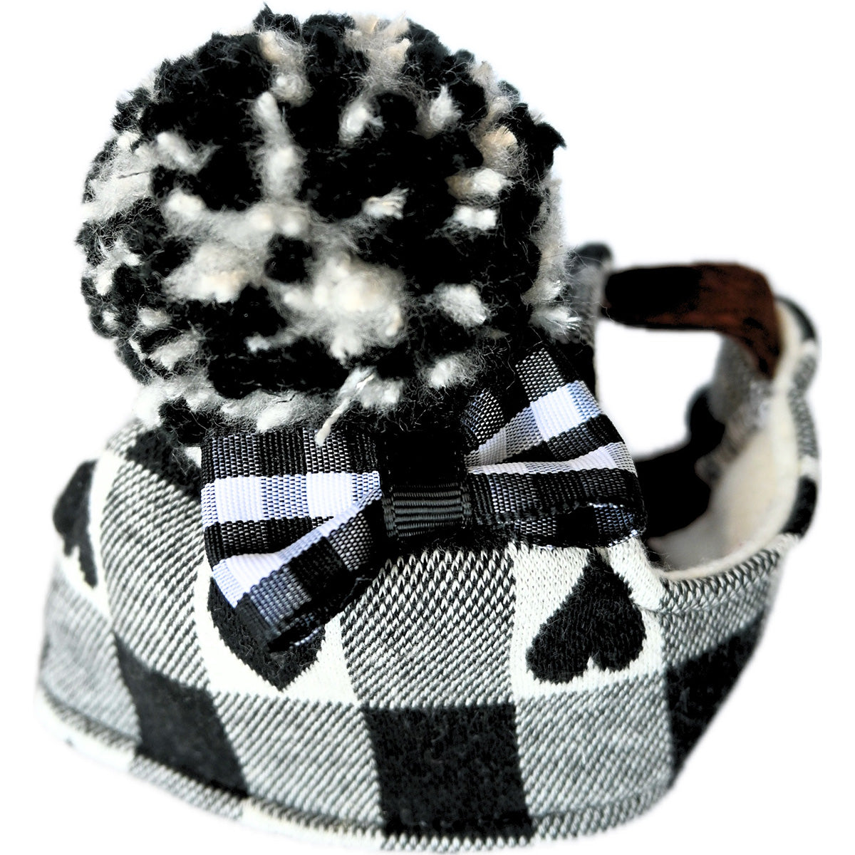 チェック柄にハート模様をあしらったラブリーなニットパイロット帽です。トップのポンポンとリボンがアクセント!