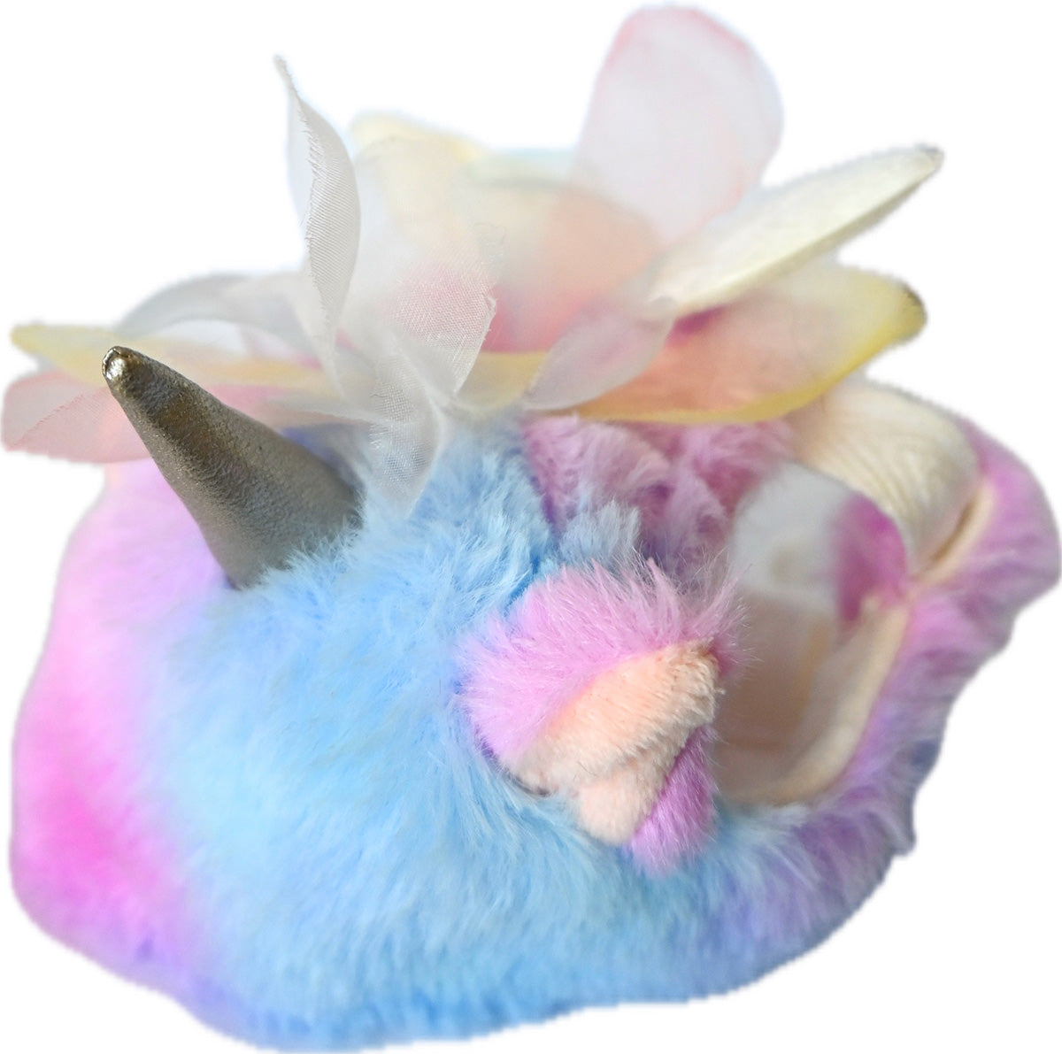 かわいいユニコーンに変身できるパイロット帽子。パステルカラーの優しい色合いに、キラッと輝く角と透け感のあるお花チュールのたてがみ。小さな羽根つきでまるで本物のユニコーン!