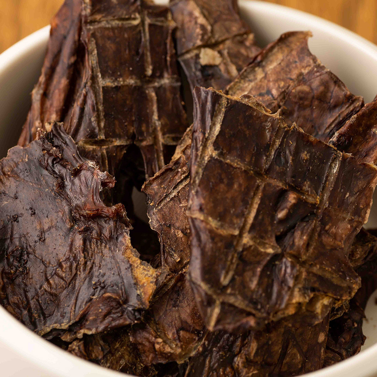 | 低温・じっくり乾燥させた無添加・ヒューマンハイグレード。しかも、肉類は薄切り。手で裂けるので老犬にも食べやすい秋田産牛の肺を乾燥させたジャーキーです 。ミネラル豊富で柔らかめなので、老犬にもおすすめです。 | |