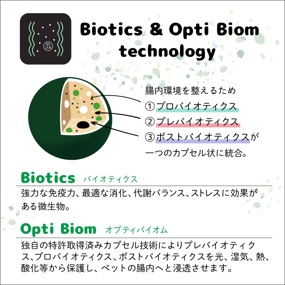 | ■究極のマイクロカプセル技術「オプティバイオム」■ ・独自の化学技術で3つのバイオティクスを1つのカプセルに閉じ込めてゆっくり放出。適切な場所へと運びます。 | |