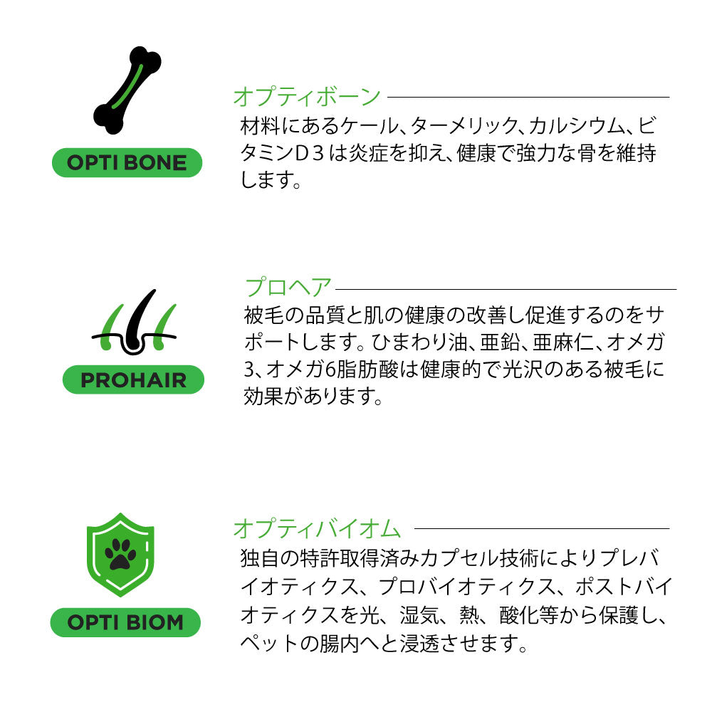 | 原材料 | エンドウ豆、乾燥酵母、緑レンズ豆、白いんげん豆、ひよこ豆、キャノーラ油(ミックストコフェロールで保存)、第一リン酸カルシウム、亜麻仁、ひまわり油(ミックストコフェロールで保存)、炭酸カルシウム、ゴマ、アップルポマース、アルファルファミール、ナチュラルフレーバー、塩、酵母培養液 、塩化コリン、レシチン、DL-メチオニン、タピオカ、タウリン、塩化カリウム、プロピオン酸カルシウム、塩酸ベタイン、ビタミンE、L-スレオニン、L-リジン、ドライケルプ、乾燥藻類、酵母エキス、チコリ根エキス、ビタミンC、L-カルニチン、ニンジン、カボチャ、リンゴ、ケール、ホウレンソウ、ザクロ、クランベリー、ブルーベリー、ブラックベリー、アボカド、ターメリック、緑茶エキス、ユッカシジゲラエキス、フマル酸、乳酸、クエン酸、リンゴ酸、硫酸第一鉄、酸化亜鉛、キレート亜鉛、硫酸銅、キレート銅、亜セレン酸ナトリウム、ビタミンB12、葉酸、ニコチン酸、ビタミンA、パントテン酸カルシウム、酸化マンガン、キレートマンガン、リボフラビン、ビオチン、ピリドキシン塩酸塩、チアミン硝酸塩、ビタミンD3、ヨウ素酸カルシウム、キレートコバルト、エンテロコッカス・フェシウム発酵物、バチルス・サブチリス発酵物、バチルス・リケニフォルミス発酵物、バチルス・アミロリクファシエンス発酵物 |