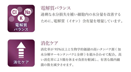 『電解質バランス』過剰な水分損失を補い細胞内の水分量を改善するために、電解質(イオン)含有量を増量しています。 『消化ケア』消化率が95%以上と生物学的価値の高いタンパク源(加水分解サーモンタンパクと全卵)を組み合わせて配合。 高い消化率により腸を休ませ負担を軽減し、有害な腸内細菌の数を減少させます。 『グレインフリー』食物アレルギー、食物不耐性といったリスク低減のために穀物不使用、小麦不使用。 消化にかかる胃腸への負担を軽減することで効果を最大限に。 『SOD(スーパーオキシドジスムターゼ)』凍結乾燥メロン抽出物からなる SOD を配合しておりSODは抗酸化酵素で、活性酵素による細胞や組織の損傷を防ぐ働きがあります。 『XOSプレバイオティクス』消化されずに腸まで届くキシロオリゴ糖類(X0S)を配合しており、健康な腸内フローラをサポートし免疫細胞の生産と調整という役割を果たします。 『Fit-aroma』Fit-aromaにはセイヨウトチノキが配合されています。 セイヨウトチノキに含まれる主要成分エスシンには、腸の蠕動を遅らせ、消化酵素をより長く作用させることで、腸の健康維持をサポートします。 『総合栄養食』VetSolutionはすべての種類でFEDIAFの栄養基準を満たしています。 ※FEDIAF(欧州ペットフード工業連合会) EU各国のペットフード工業会で構成され ペットフードの栄養、製造に関するガイドラインを定めています。 | |