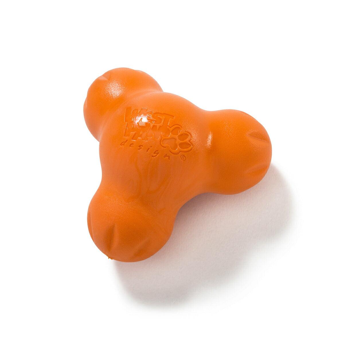 | 「タックス」はちょっと変わった形のおもちゃで、中央に空いたくぼみにフードやおやつを詰めることができます。くぼみは複雑な形をしており、なかなか中身を取り出すことができないのでワンちゃんを夢中にさせます。粒状のドライフードやクッキーなどはもちろん、ヨーグルトやペースト状のおやつを詰めてもOK。そのまま凍らせれば、暑い季節にぴったりのおもちゃになります。また、通常の丸いボールよりも不規則にバウンドするので、ボール遊びに使うのもオススメです。「ゾゴフレックス」シリーズのおもちゃは、とにかく丈夫なのが自慢。タックスはシリーズの中でも特に丈夫な部類に入り、噛む力が強いワンちゃんも簡単には壊せません。それでいて柔軟性もあり、独特の弾力はワンちゃんにとって楽しい噛み心地。BPAフリー、フタル酸フリー、ラテックスフリーなので安心してワンちゃんを遊ばせてあげられます。 | |